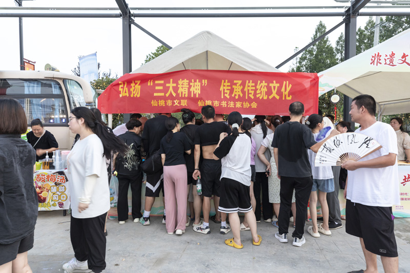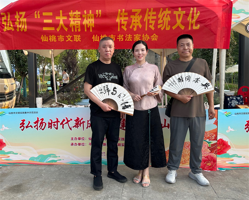 2、2025年7月16日下午,市书法家协会党支部书记张国旗、副秘书长饶艾平、黄丹一行3人顶着高温驱车来到袁市村党员群众服务中心,参加了市委宣传部组织的弘扬“三大精神”,传承传统文化文艺宣传活动,为群众现场挥毫泼墨,送出折扇200多把。
