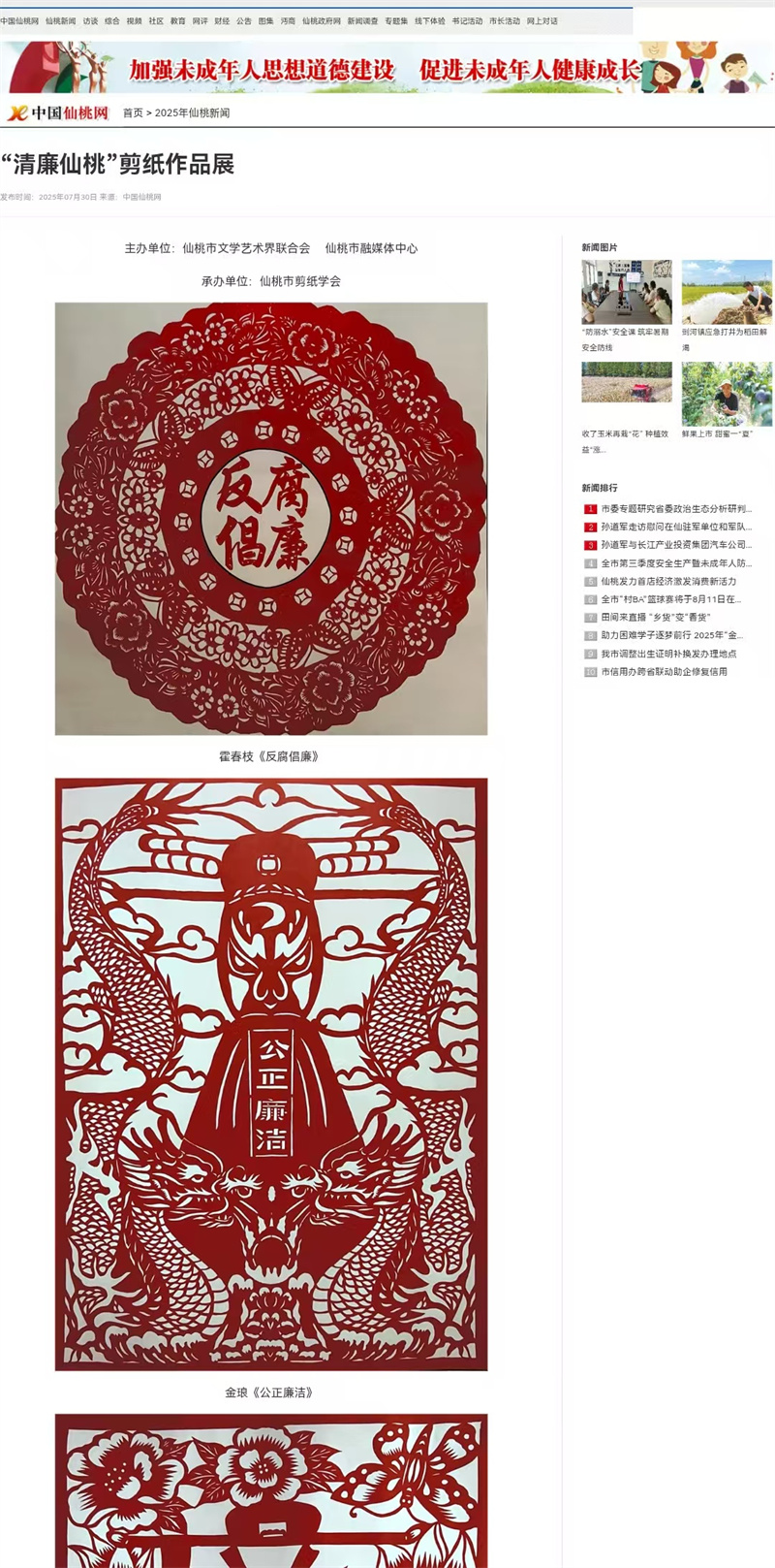 4、2025年7月30日,由市文联、市融媒体中心主办,市剪纸学会承办的“清廉仙桃”剪纸作品展,在中国仙桃网展出,共展出作品20副,将“清廉”主题与民俗文化相融合,兼具观赏性与教育意义。