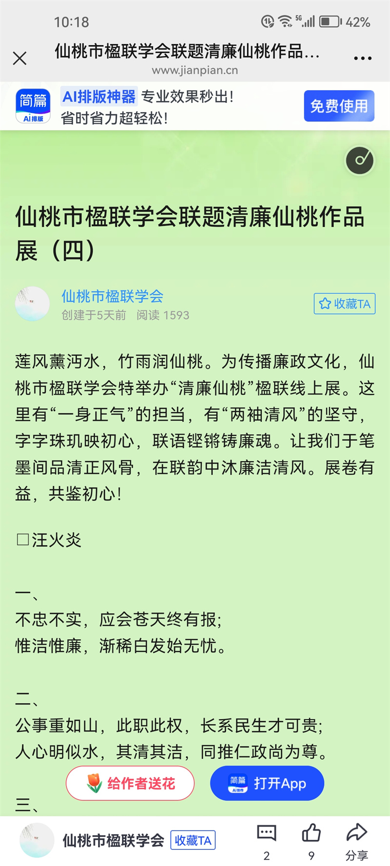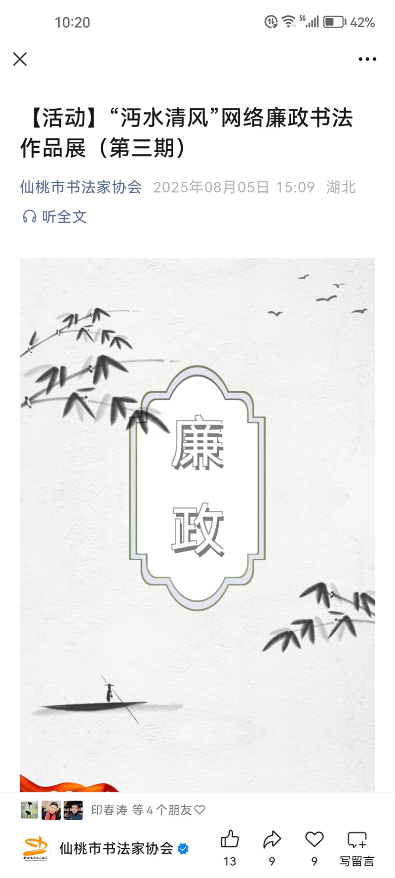 5、2025年8月,按照全市"清廉仙桃"建设工作要求,市文联所属各协(学)会认真谋划、积极组织开展了文艺创作、展示活动。市剪纸学会在中国仙桃网展出1期廉政剪纸作品,市书法家协会在微信公众号推出3期廉政书法作品展,市楹联学会连续推出5期廉政楹联作品线上展、市作家协会主办刊物《汉水文苑》刊登廉政小说1篇。