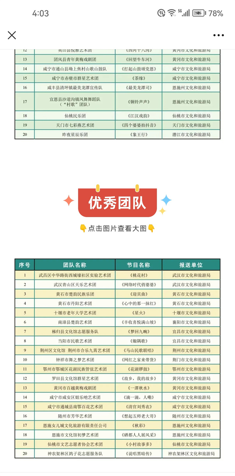 6、2025年8月23日,湖北省文化和旅游厅公布关于“文化力量·民间精彩”湖北省第四届社会文艺团队展演评审结果,仙桃市文艺志愿者协会艺术团携原创作品《小村故事多》获得“优秀团队”荣誉称号。