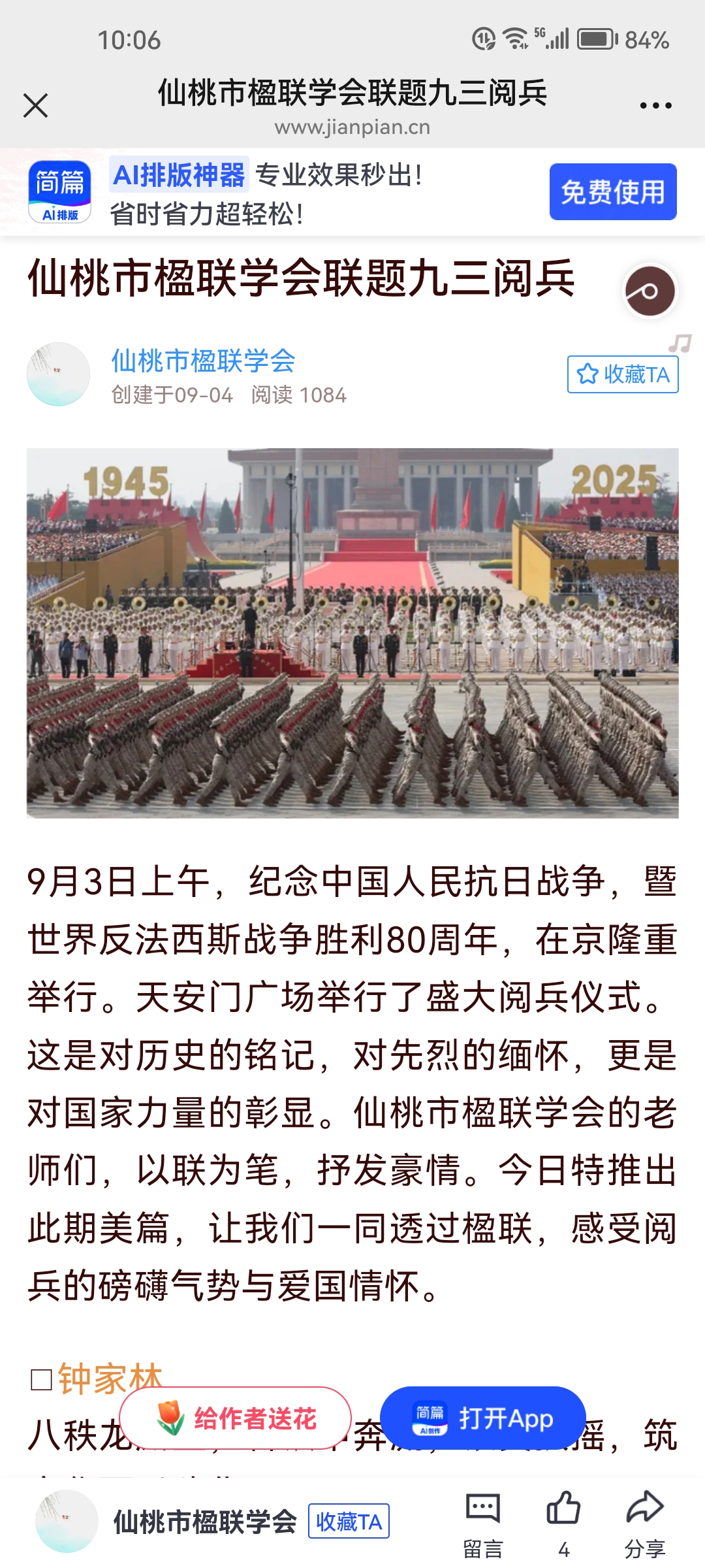 1、2025年9月,为纪念中国人民抗日战争和世界反法西斯战争胜利80周年,市文联组织开展了一系列丰富多彩的群众性纪念活动。市楹联学会举办联题纪念抗战胜利八十周年活动,在美篇上登载2期,共有22人参与。市摄影家协会。在抗战胜利80周年之际,在微信公众号专题编发了1期抗战老兵影像,让更多人通过镜头感受到了老兵们的英勇无畏和那段波澜壮阔的历史。9月3日,市摄协、美协、剪纸学会、文艺志愿者协会等组织100多名会员集中观看了阅兵仪式,铭记历史,缅怀先烈,传承和弘扬伟大的抗战精神。