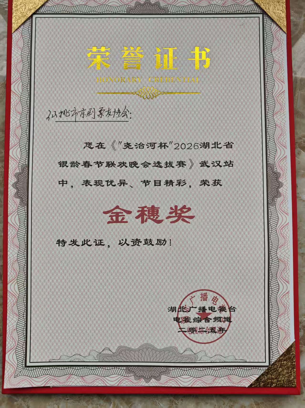 6、2025年9月26日至28日,湖北广播电视综合频道在武汉国博中心举办“尧治河杯”2026湖北省银龄春节联欢晚会选拔赛,来自全省各市、州70多个社会团队参加竞争,市京剧票友协会编排的大型京歌《花神赋》获得“金穗奖”。