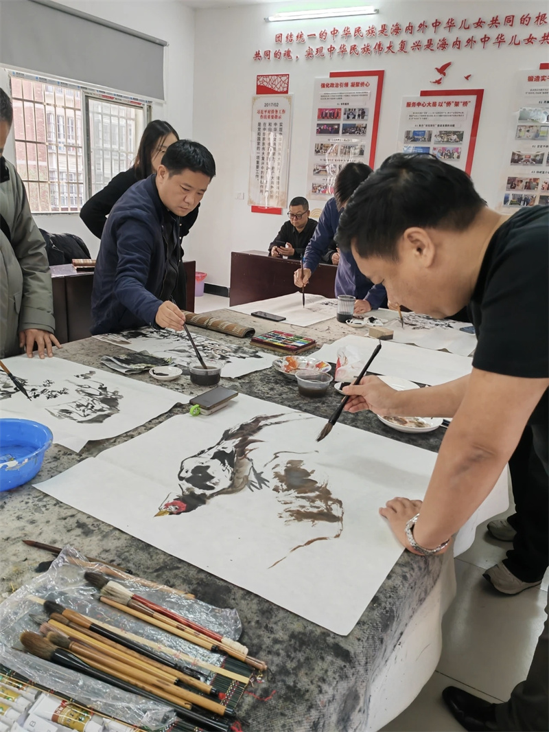 4、2025年12月11日,由市侨联组织,市美协与翰彩中美艺术交流研究院联合开展文化艺术交流活动。代表团先后走访张沟镇养鳝基地、九合垸兰花基地,实地感受乡村振兴与生态发展成果。在梅湖社区举办笔会,艺术家们现场创作,以水墨展现自然之美与中美艺术交融情谊。