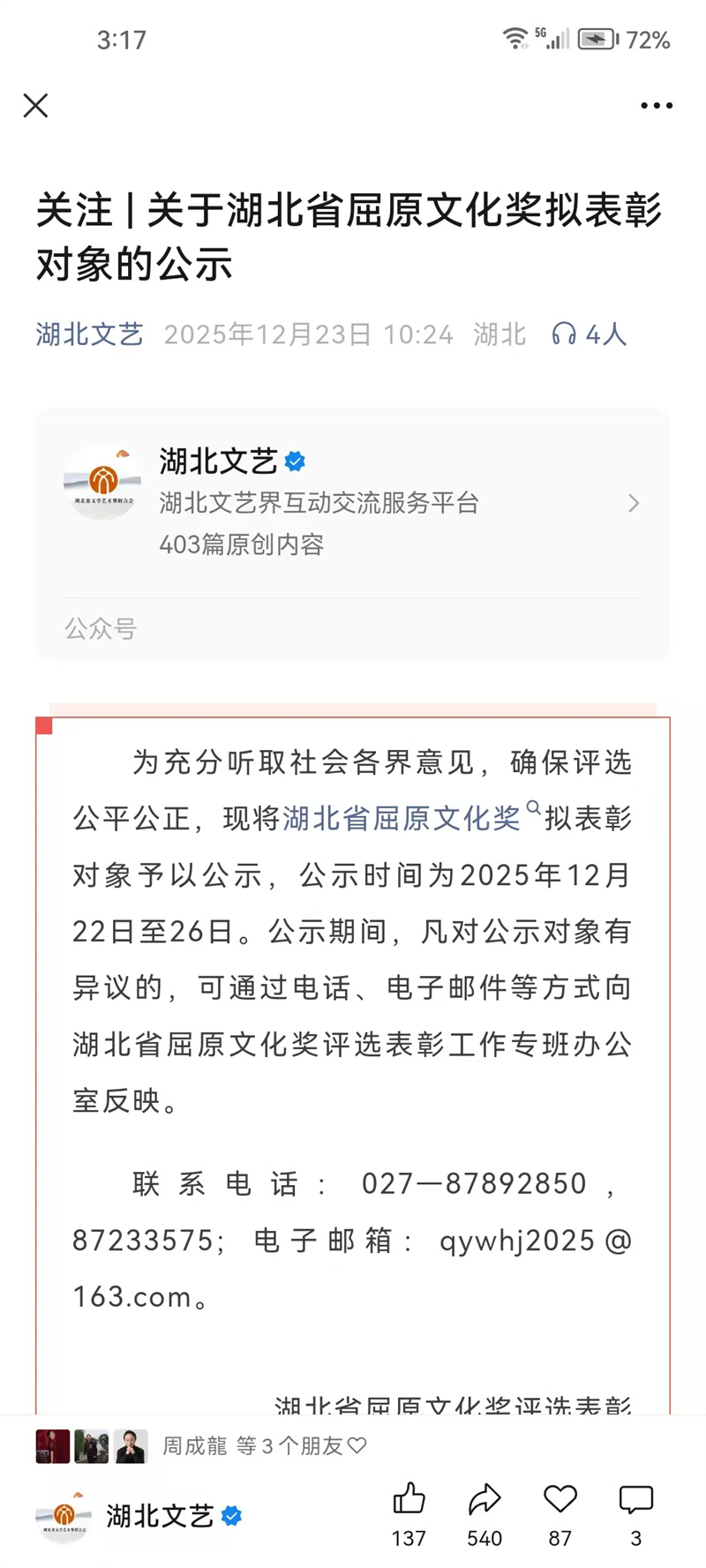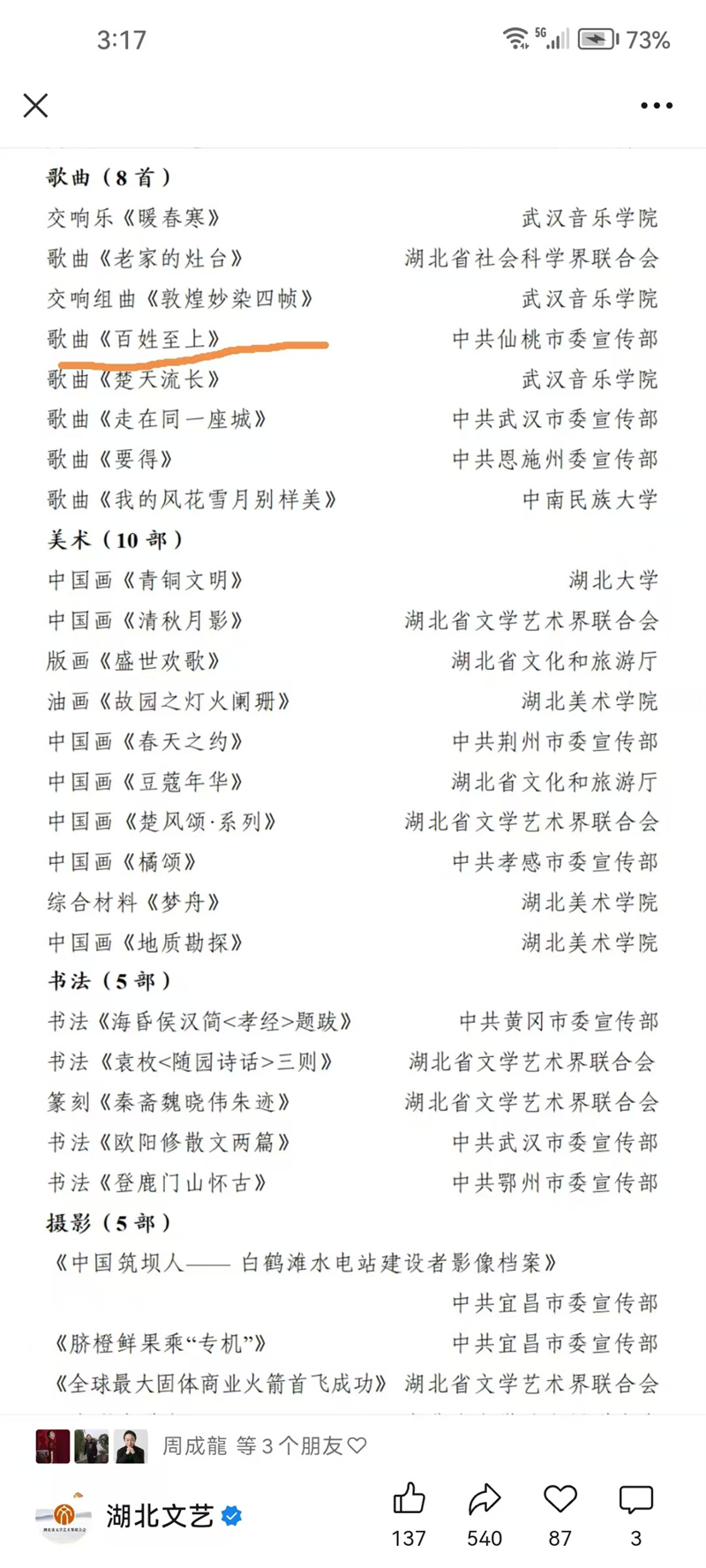7、2025年12月22日,湖北省屈原文化奖入选作品公示,由市文联选送,市委宣传部报送的作品《百姓至上》入选歌曲类奖项。《百姓至上》由我市一级编剧、享受国务院特殊津贴专家梁和平作词,著名作曲家戚建波作曲,歌词紧扣生活,韵律豪迈大气。
